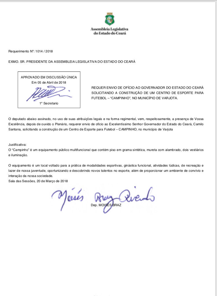 Durante o evento de inauguração da Areninha do Castelão e da assinatura da ordem de serviço para construção de 145 Areninhas Tipo 2 (campinhos) em municípios do interior do Ceará, ocorrido na última segunda-feira, 11, em Fortaleza, o governador Camilo Santana (PT) também atendeu ao requerimento 10/2018, do deputado estadual Moisés Braz (PT) e autorizou a construção do campinho no município de Varjota, a Zona Norte do Estado.