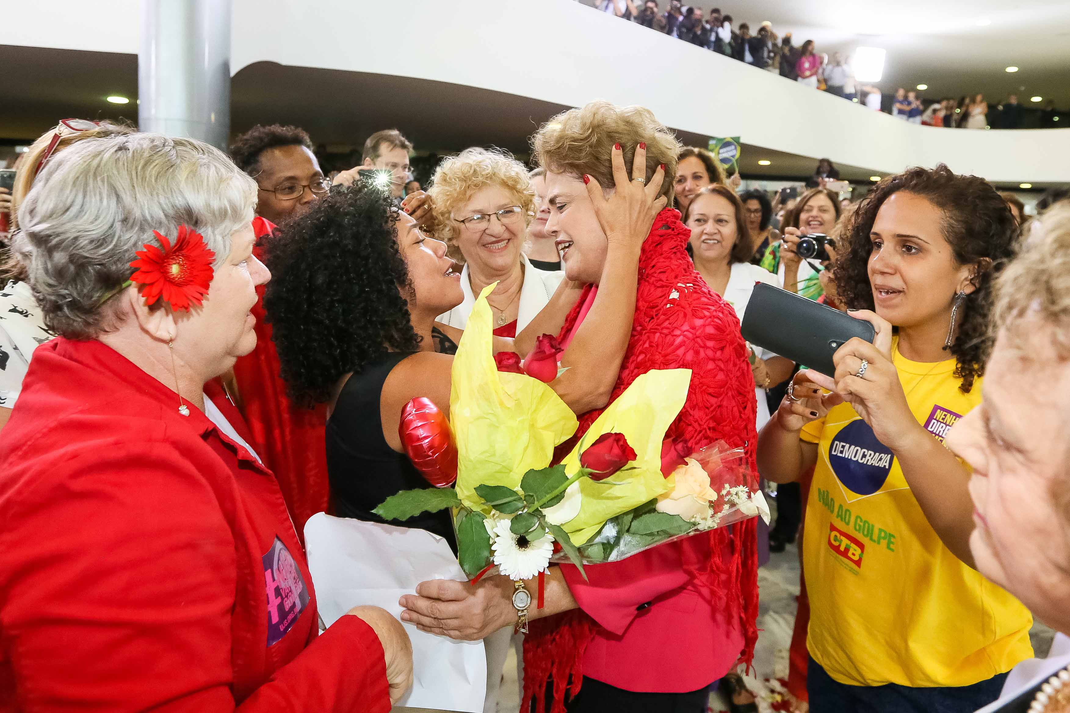 “Eu não perco o controle, não perco o eixo, não perco a esperança porque eu sou mulher. Não controle, o eixo e a esperança porque me acostumei a lutar por mim e pelos que eu amo. Amo a minha família, amo o meu país, amo o meu povo”, completou Dilma.