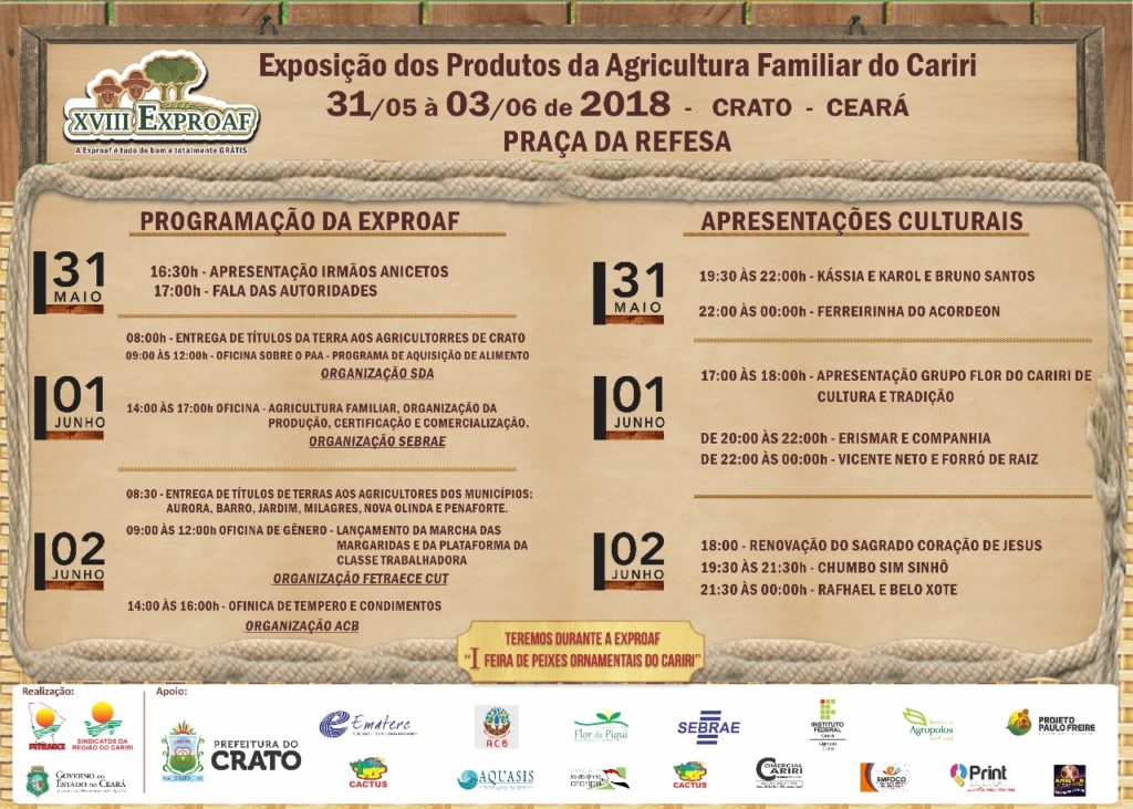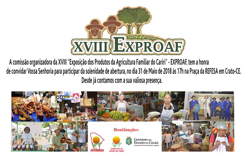De 31 de maio a 03 de junho, acontece em Crato a XVIII Exposição dos Produtos da Agricultura Familiar do Cariri (Exproaf). Realizada anualmente no Parque de Exposição Pedro Felício Cavalcanti, este ano, em decorrência das obras de reforma e ampliação do parque, previstas para ser entregue na última semana de junho, a Exproaf será promovida no Largo da Rffsa.