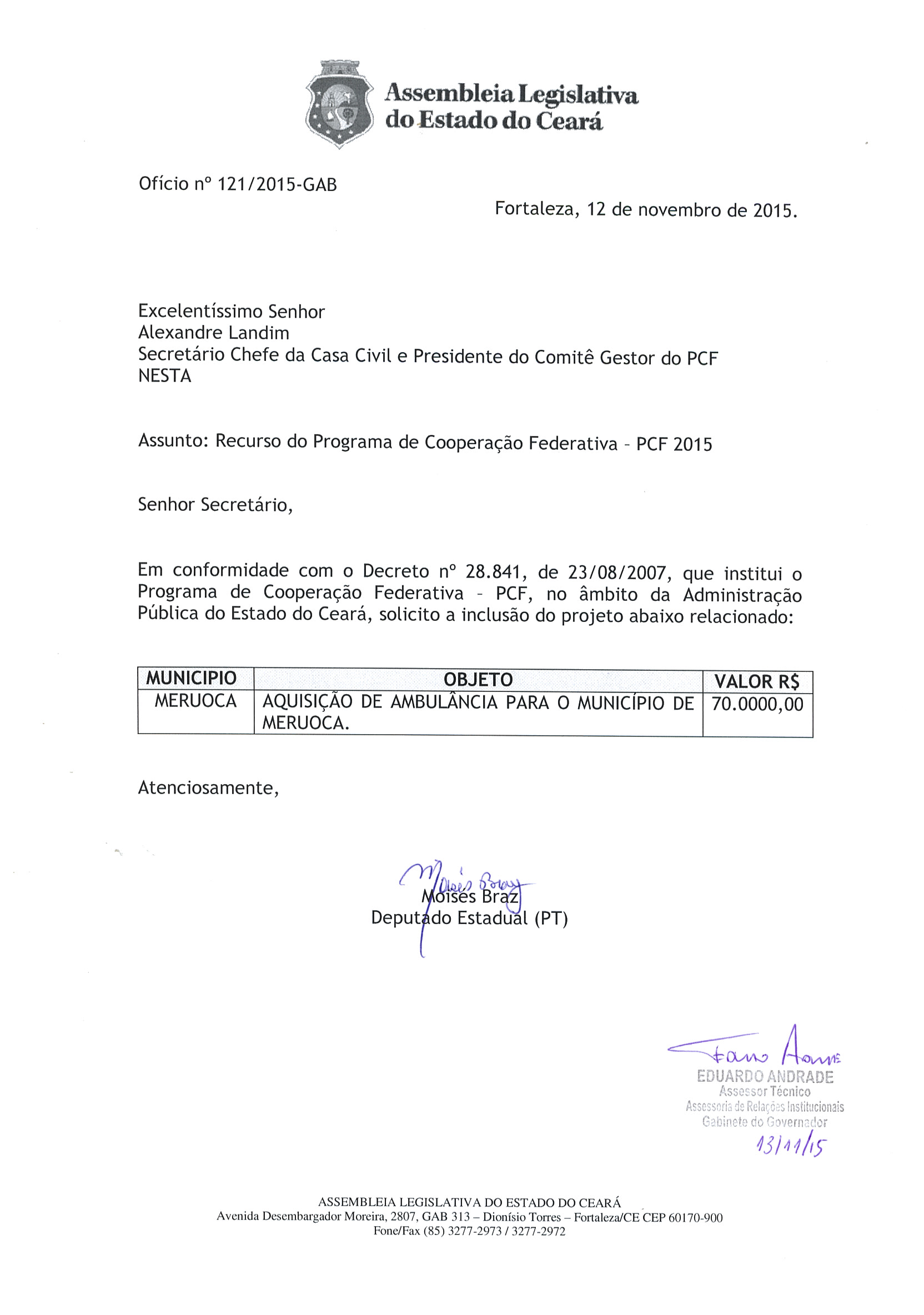 Na última sexta-feira, 31 de março, a população de Meruoca recebeu da Prefeitura Municipal uma ambulância no valor de R$ 70 mil. A aquisição do veículo foi possível graças a uma emenda do deputado estadual Moisés Braz (PT) ao Programa de Cooperação Federativa (PCF) do Governo do Estado do Ceará do ano de 2015.