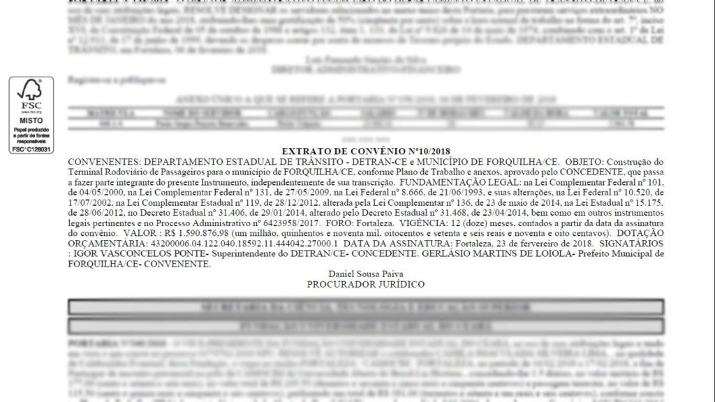 O Diário Oficial do Estado (DOE) publicou na edição do dia 27 de fevereiro o Extrato de Convênio nº 10/2018, firmado entre o Governo do Estado, por meio do Departamento Estadual de Trânsito (Detran-CE) e a Prefeitura de Forquilha. O objeto do convênio prevê o repasse de R$ 1,51 milhão para a construção do Novo Terminal Rodoviário de Passageiros do município. A contrapartida da Prefeitura de Forquilha é de R$ 79 mil.